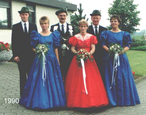 Königspaar: Georg u. Petra Biedemann geb. Schattmann Thronpaar links: Willi u. Wilma Schattmann geb. Heix Thronpaar rechts: Hans-Peter Mertens u. Christa Bollen