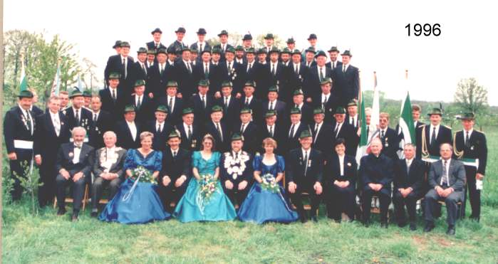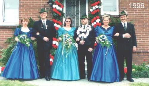 Königspaar: Rainer u. Rita Verhülsdonk geb. Verhoeven Thronpaar links: Karl-Heinz u. Gabi Baaken geb. Hekrens Thronpaar rechts: Egon u. Doris Bauten geb. Bremenkamp